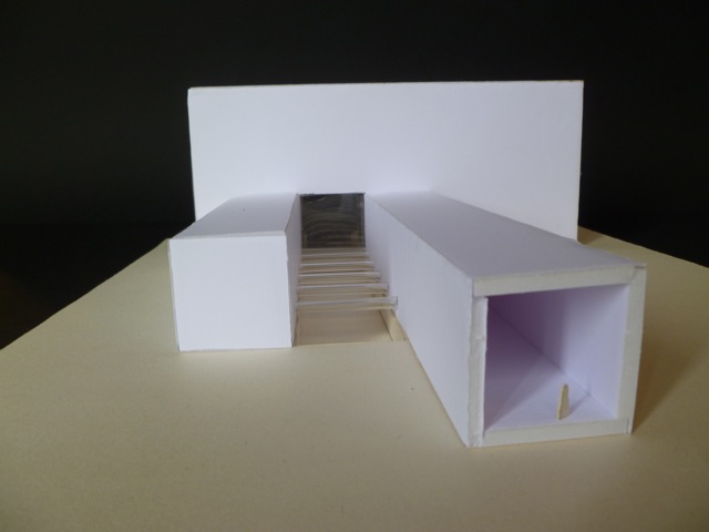C’è poi una terza via, non generata da causa ed effetto, come le altre due. Una linea che attraversa il tempo. Una storia irriconoscibile, che però impone una congiunzione. Nel mio plastico questa terza linea è rappresentata dallo spazio che divide le due storie, i due edifici. Un percorso scavato che mira anch’esso all’unico contenitore finale, ma poi lo supera e continua per raggiungere le altre storie, tutte le storie, che ancora devono compiersi.